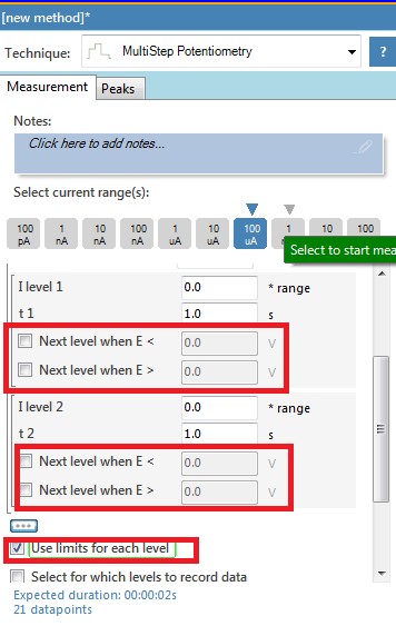 پس از انتخاب این تکنیک در صفحه تنظیمات، می‌توانید در قسمت cycles تعداد سیکل مورد نیاز و در قسمت levels تعداد جریان‌های لازم برای شارژ و دشارژ را وارد کنید. در قسمت I Level1 جریان شارژ و t1 زمان مورد نیاز شارژ و در قسمت I level 2 و t2 جریان و زمان مورد نیاز برای دشارژ را وارد کنید. با کلیک روی شده در شکل زیر نیز می‌توانید محدوده پتانسیل را در هر level کنترل کنید.